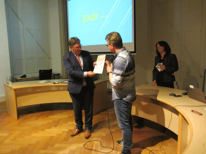 Burgemeester Gregor Rensen ontvangt uit handen van Bob Benschop het eerste exemplaar van het themanummer van de Brielse Mare,